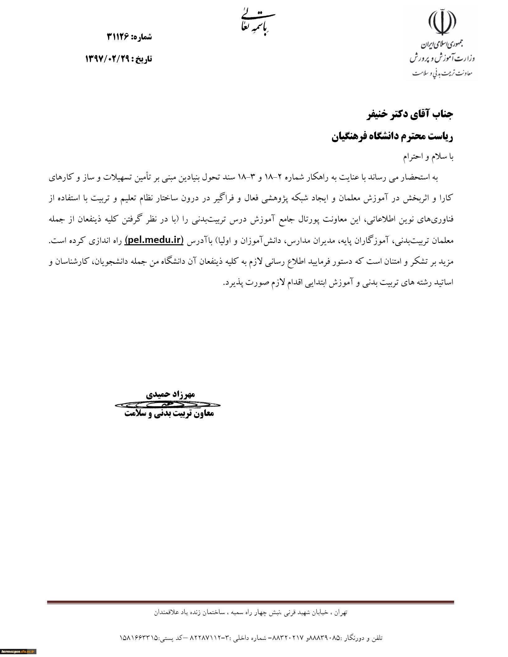 قابل توجه اساتید ، کارکنان و دانشجو معلمان : بخشنامه معاونت تربیت بدنی و تندرستی 2