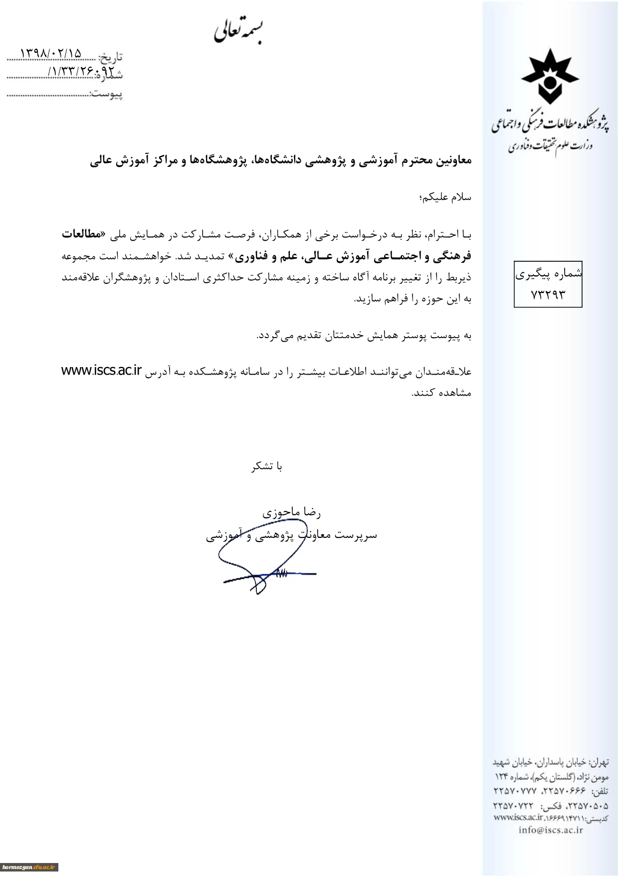 امتیاز دهید : فراخوان همایش ملی مطالعات فرهنگی و اجتماعی آموزش عالی، علم و فناوری 5 چهارشنبه 25 اردیبهشت 1398 ساعت 8:06