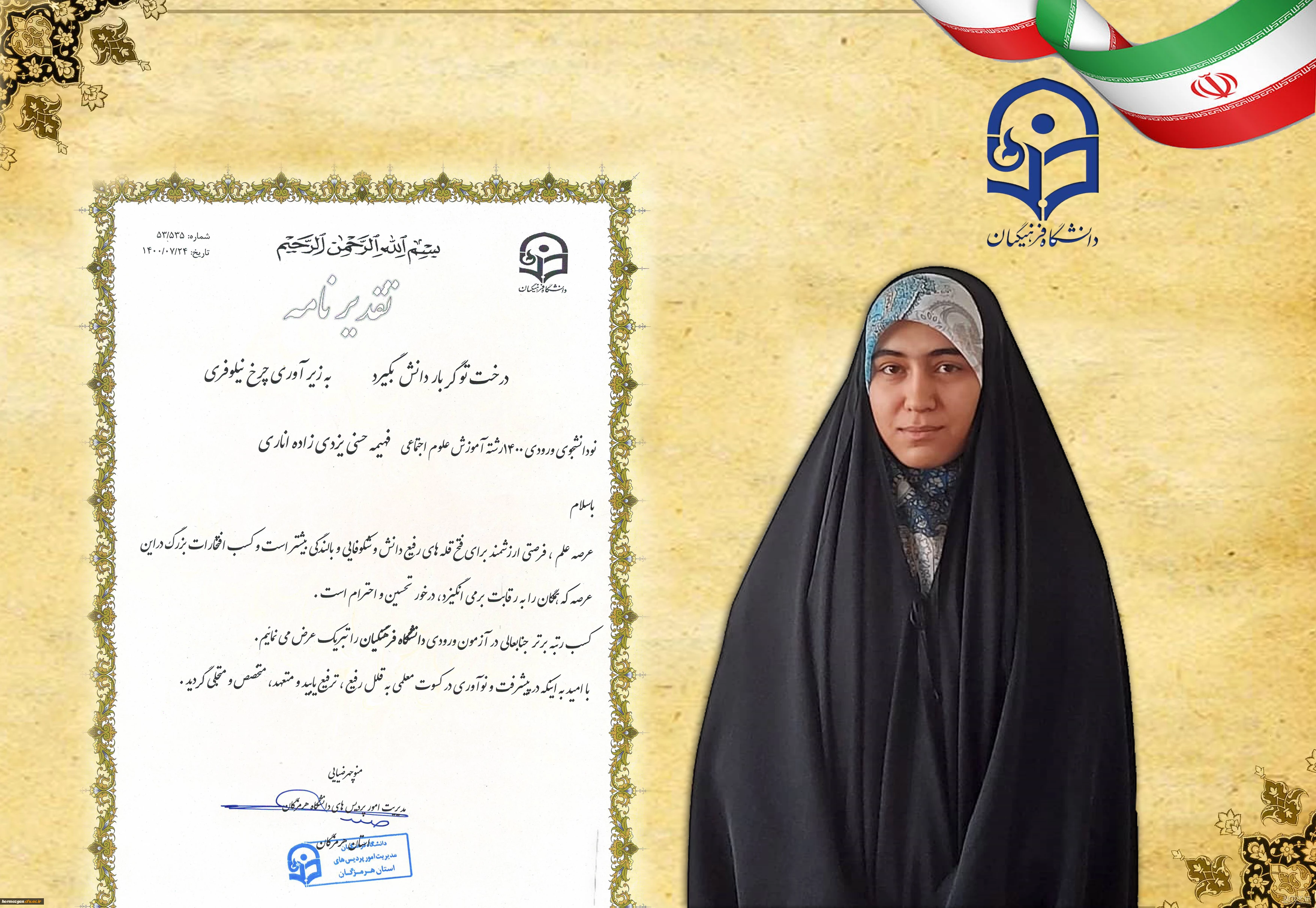 تجلیل و تقدیر از سرکار خانم فهیمه حسنی یزدی زاده ، دانشجو معلم ورودی 1400 دانشگاه فرهنگیان هرمزگان در آیین کشوری استقبال از نو دانشجویان با رتبه 22 کشوری 2