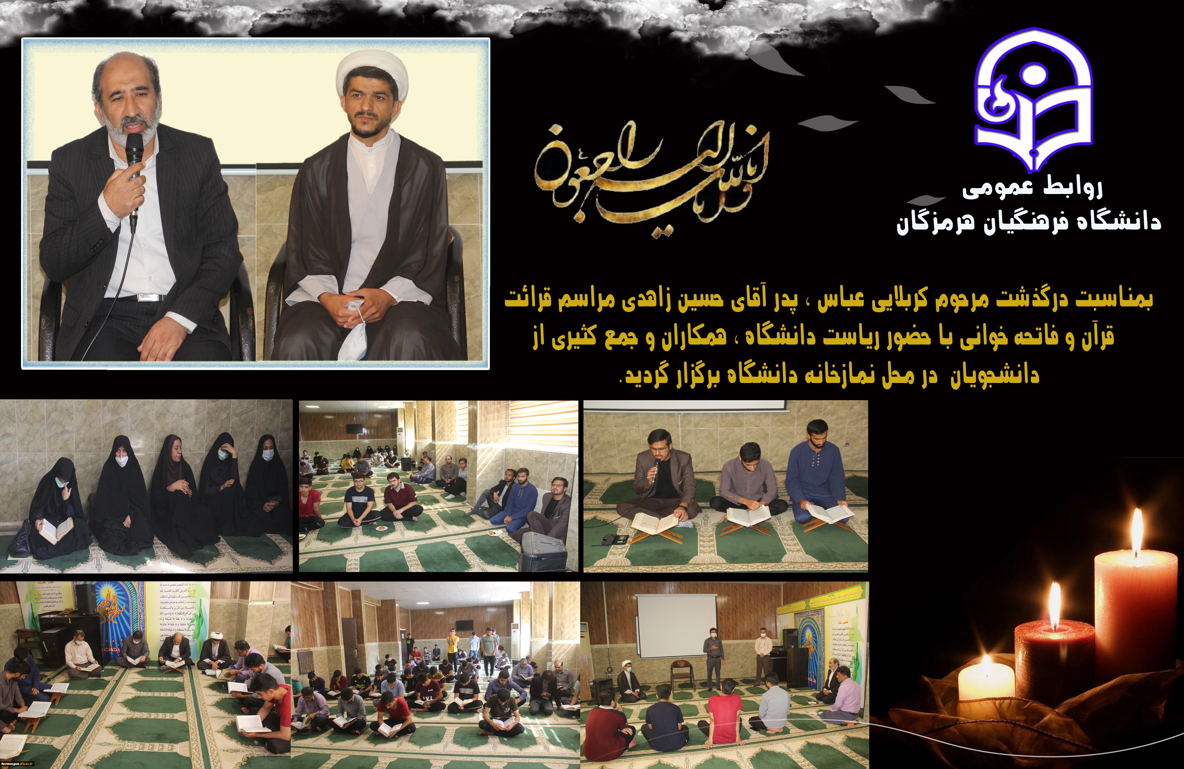 بمناسبت درگذشت مرحوم کربلایی عباس ، پدر آقای حسین زاهدی مراسم قرائت قرآن و فاتحه خوانی با حضور ریاست دانشگاه فرهنگیان هرمزگان ، همکاران و جمع کثیری از دانشجویان در محل نمازخانه دانشگاه برگزار گردید. 2
