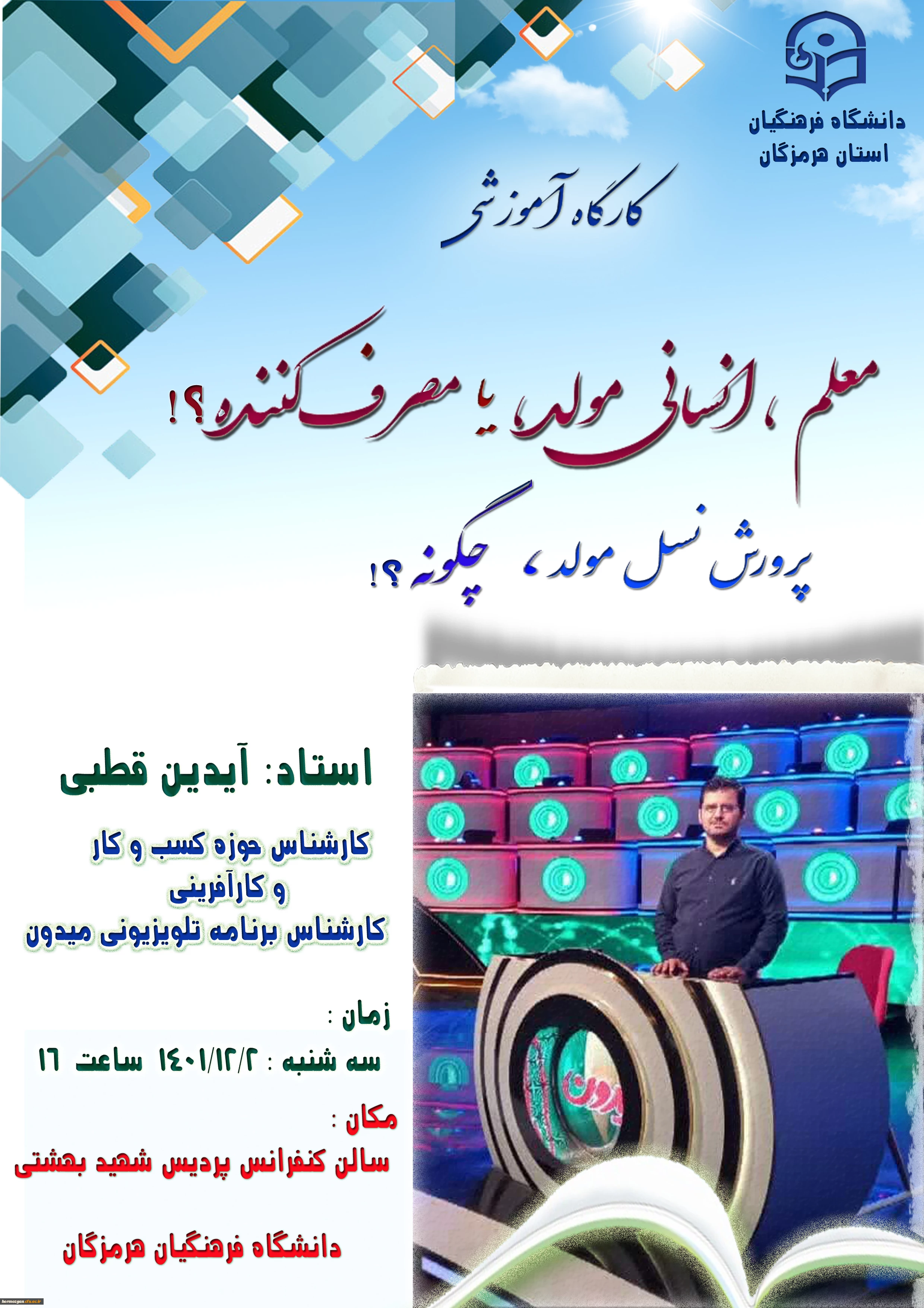 کارگاه آموزشی با موضوع ( معلم ، انسانی مولد ، یا مصرف کننده؟! ) درسالن کنفرانس پردیس شهید بهشتی ( دانشگاه فرهنگیان هرمزگان ) برگزار گردید. 2