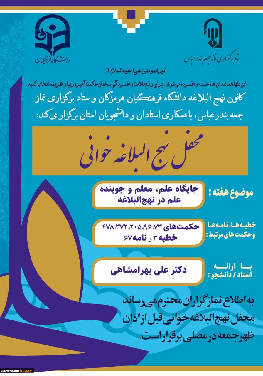 سخنرانی دکتر بهرامشاهی ، مدیریت امور پردیس های دانشگاه فرهنگیان هرمزگان ، قبل از خطبه های نماز جمعه بندرعباس با موضوع جایگاه علم ، معلم و جوینده علم در نهج البلاغه 2