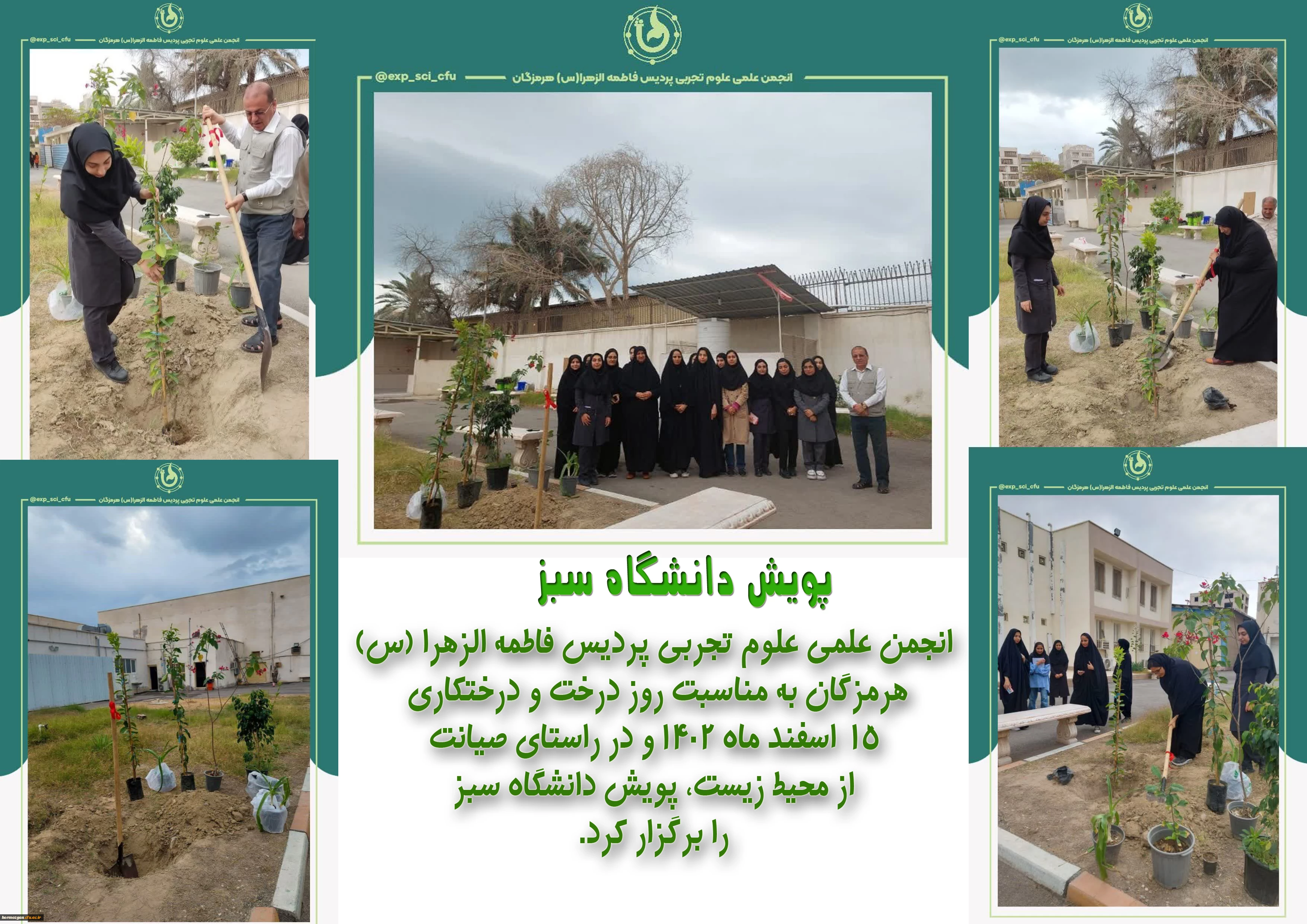 انجمن علمی علوم تجربی پردیس فاطمه الزهرا (س) هرمزگان به مناسبت روز درخت و درختکاری ۱۵ اسفند ماه ۱۴۰۲ و در راستای صیانت از محیط زیست، پویش دانشگاه سبز را برگزار کرد. 2
