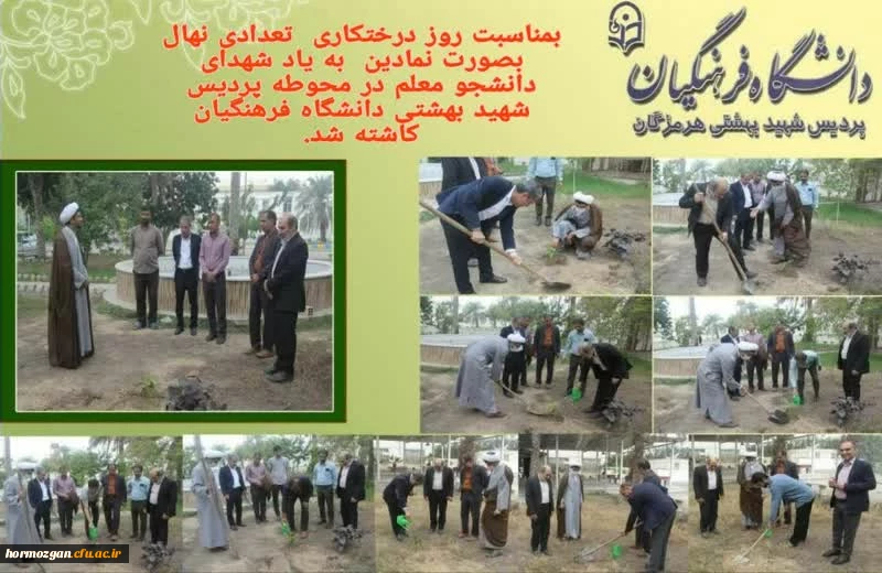 بمناسبت روز درختکاری با حضور مدیریت دانشگاه ، مسئولین و دانشجو معلمان دانشگاه فرهنگیان تعدادی نهال بصورت نمادین به یاد شهدای دانشجو معلم در محوطه پردیس شهید بهشتی دانشگاه فرهنگیان کاشته شد. 2