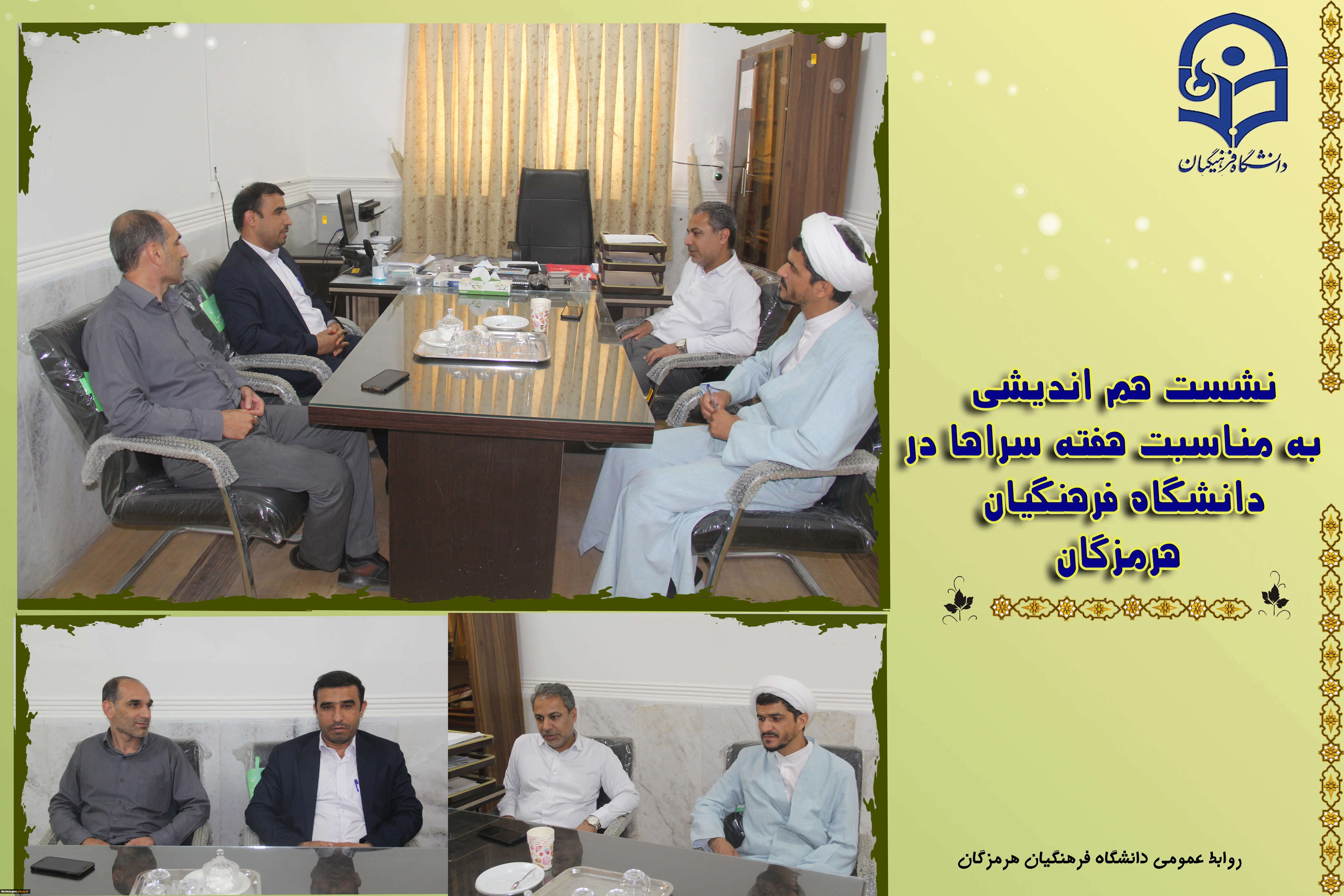نشست هم اندیشی به مناسبت هفته سراها، با حضور معاونت دانشجویی، حراست و نهاد نمایندگی رهبری در دانشگاه به منظور روحیه، نشاط،سلامت ، مشارکت و همدلی دانشجو معلمان دردانشگاه فرهنگیان هرمزگان برگزار گردید. 2