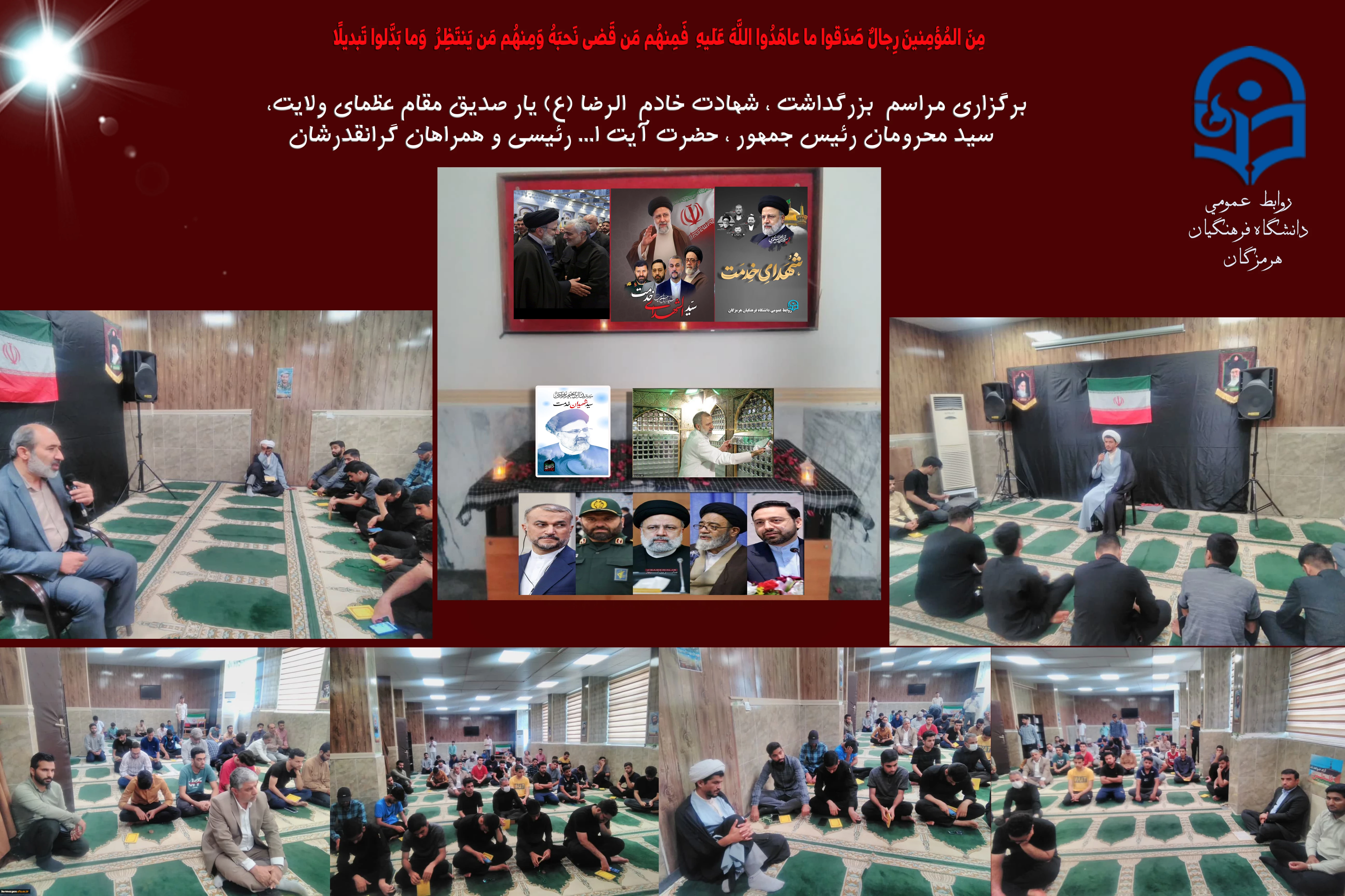 برگزاری مراسم بزرگداشت ، شهادت خادم الرضا (ع) یار صدیق مقام عظمای ولایت، سید محرومان رئیس جمهور ، حضرت آیت ا... رئیسی و همراهان گرانقدرشان را در سالروز ولادت ثامن الحجج (ع)درنمازخانه پردیس شهید بهشتی با حضور پرشور دانشجو معلمان ،مسئولین، اساتید و کارکنا