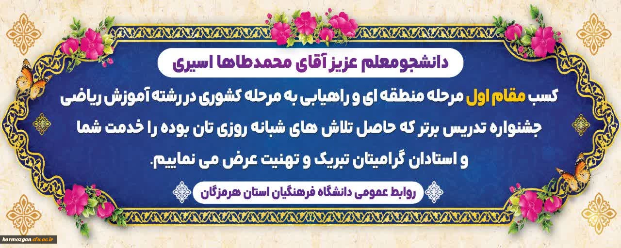 امتیاز دهید : دانشجومعلمان عزیز، آقای محمدطاها اسیری و آقای محمد ابولی 2 یکشنبه 4 خرداد 1404 ساعت 6:32
