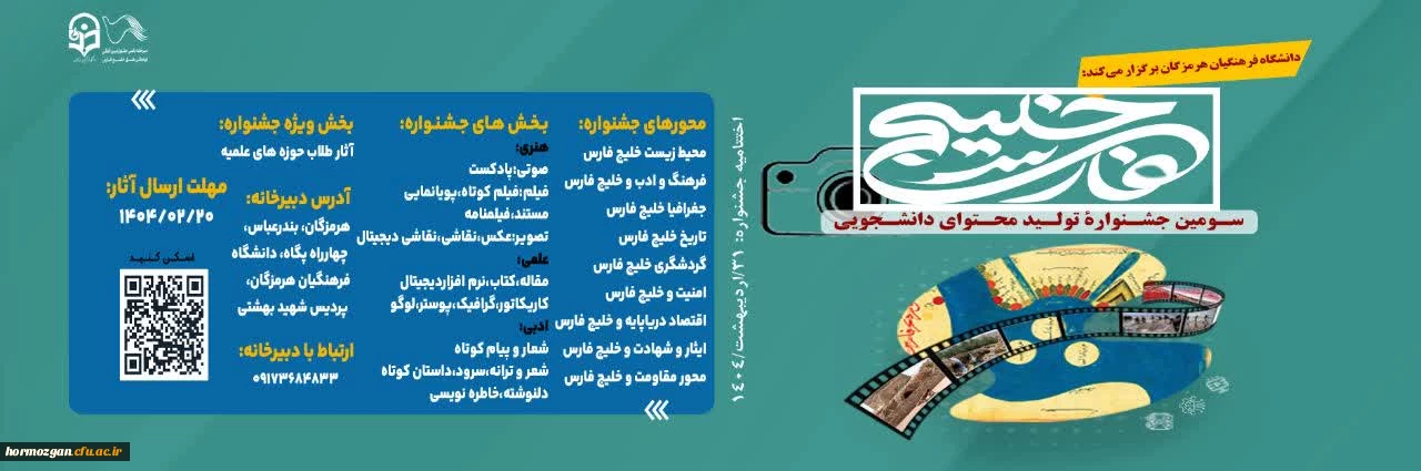 سومین جشنواره تولید محتوای دانشجویی خلیج فارس با هدف معرفی و پاسداشت هویت تاریخی، فرهنگی و استراتژیک این منطقه، در چندین محور اصلی برگزار میشود. این محورها عبارتند از: محیط زیست خلیج ...